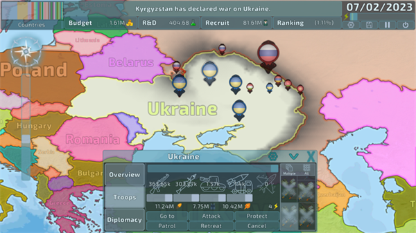 Dummynation是一款以现代战争为背景的即时策略手游,玩家将在一个虚构的世界中扮演一个国家的领导者,从零开始构建自己的军事帝国。游戏的核心玩法包括经济发展、科技研发、军队招募与训练,以及与其他玩家或AI对手的全球霸权争夺。玩家需要合理分配有限的资源,建造基地设施、研发先进科技,并生产强大的武器装备。同时,游戏还要求玩家密切关注国际形势,派遣侦察员收集情报,选择最佳时机和地点发动攻击。玩家可以指挥多种军事单位,包括步兵、坦克、炮兵和飞机,进行地面和空中的立体化作战,体验真实的现代战争。