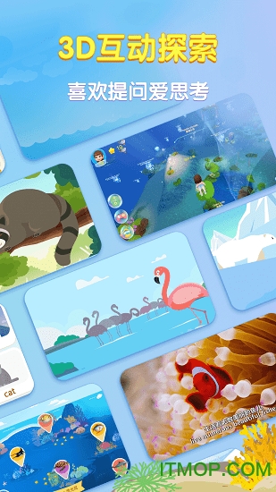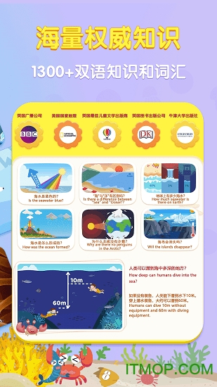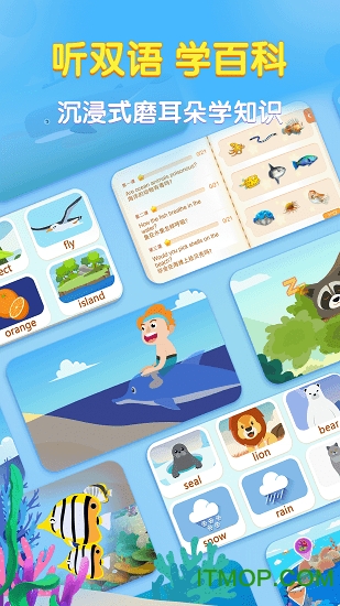 海洋世界app与欧美孩子同步,通过探索构建儿童对世界的理解和认知,全面提升知识储备的同时,轻松学习地道英语。这款应用由童年科技联手国际知名机构、百科教育学家和儿童心理专家共同打造,结合15年儿童英语教研成果,采用3D互动场景教学,培养孩子寻找知识的兴趣、方法和习惯,增强思考问题和解决问题的能力,让孩子变得爱思考、会创新。应用内容贴合3-12岁儿童认知发展规律,结合欧美语言教学标准和《中国义务教育小学科学课程标准》,独创儿童双语百科课程体系,让孩子在趣味互动中开启英语启蒙之门。