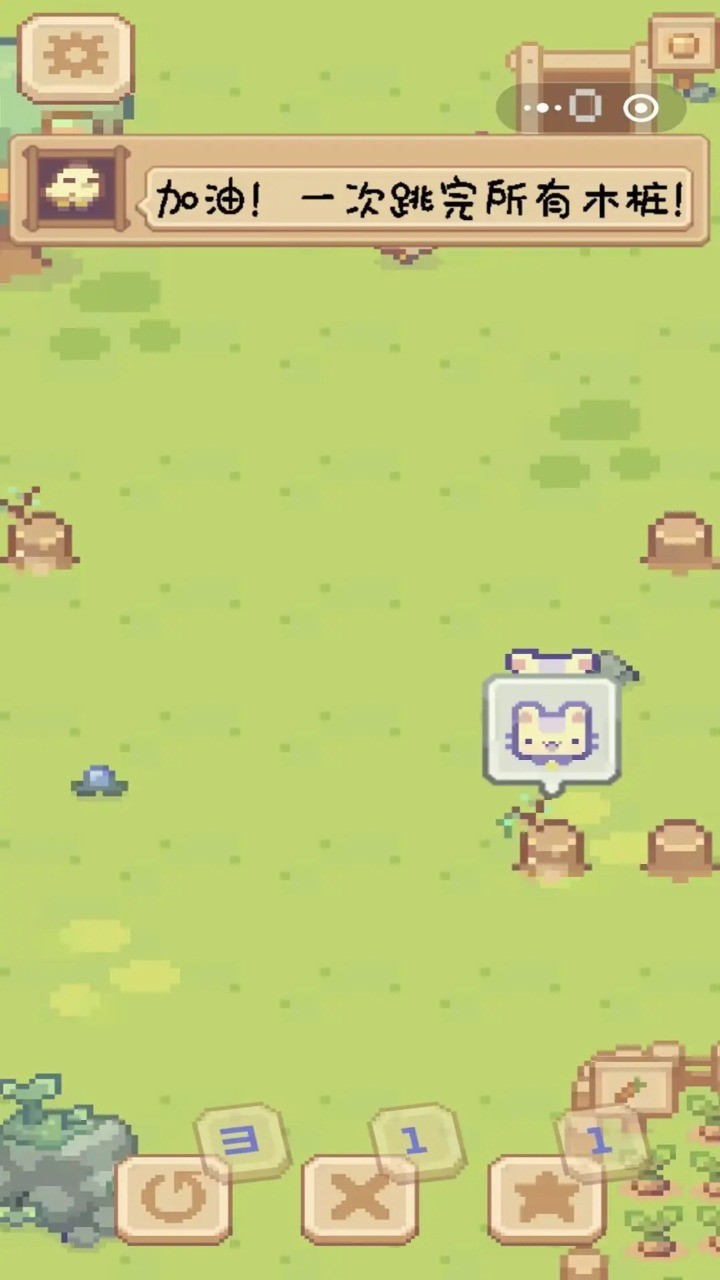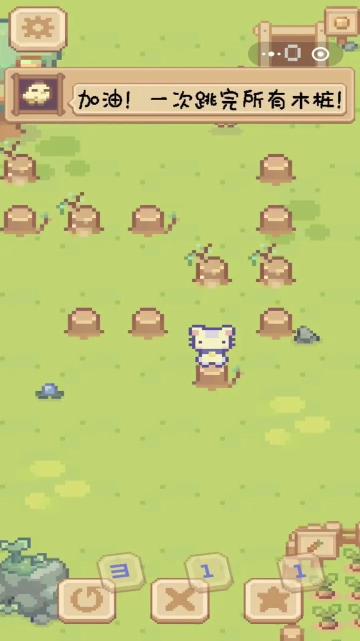 1.玩法规则非常简单,玩家只需通过点击屏幕来控制小猫,确保它踩过所有木桩即可过关。2.被踩过的木桩会消失,类似于一笔画的玩法,玩家需要提前规划好跳跃路线,避免遗漏木桩。3.在跳跃过程中,如果出现失误,玩家可以使用下方的辅助道具。游戏提供了三种功能不同的道具,数量有限,每通过一关后,玩家将随机获得其中一种道具,帮助应对后续挑战。