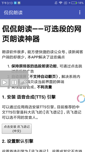 2.自动滚屏(不支持自动翻页),解决系统内置朗读工具只读当前界面的弊端