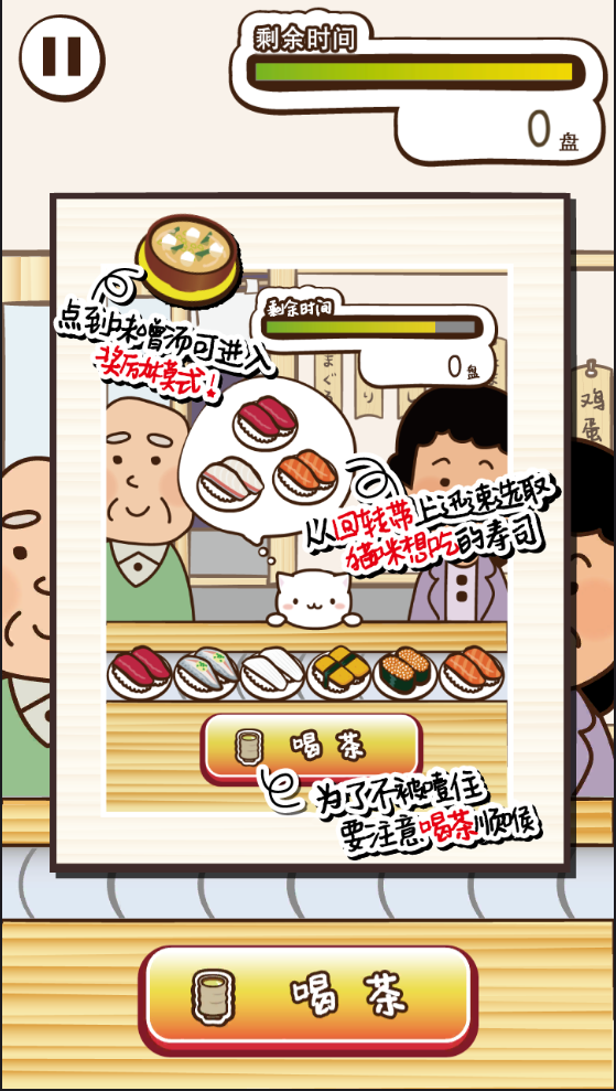 《猫咪寿司2》是一款以猫咪为主角的迷你小游戏,玩家将扮演一只饥肠辘辘的小猫,偶然路过一家回转寿司店。被寿司的香味吸引后,小猫迅速跑到座位上开始狼吞虎咽。玩家的任务就是控制这只小猫,不断吃寿司,同时要小心不被寿司店老板发现。游戏画面清新可爱,玩法简单有趣,适合所有年龄段的玩家。通过不断挑战,玩家可以解锁更多有趣的关卡和道具,增加游戏的趣味性和挑战性。