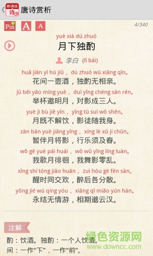 2、每首唐诗有注解、译韵、赏析。共收集340首唐诗:唐诗三百首(310首)、30首精心挑选的唐诗名篇、100多句耳熟能详的唐诗名句。这些注解和赏析不仅帮助用户理解诗歌的字面意思,还深入剖析了诗歌的意境和情感,让用户在欣赏的同时,也能提升自己的文学素养。