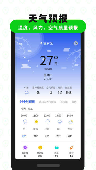 1.天气预报:提供实时天气预报,出行旅游逛街约会运动天气早知道,帮助用户提前规划行程。