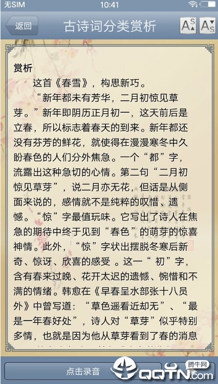 1、随时都能丰富自己的内涵,每一首古诗词讲解都很详细,还有出处介绍;篱笆的诗词解析不仅包括字面意思,还深入探讨了诗词的创作背景和作者的情感表达,帮助用户全面理解作品。此外,软件还提供了相关历史知识,让用户在欣赏诗词的同时增长见识。