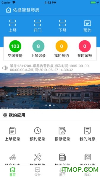 ●软件支持发布消息通知,实时监控琴房的使用数据,包括上琴中的琴房数量、空闲琴房数量、临下琴数量、预约琴房数量等,帮助管理员全面掌握琴房使用情况。