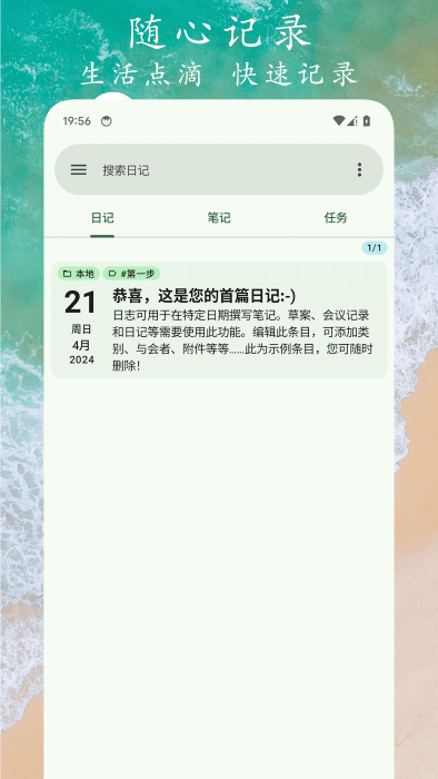 任务笔记不仅支持文字记录,还可以添加照片、音频和位置信息,让您的日记更加丰富多彩。无论是记录每日的心情,还是保存旅行的美好瞬间,都能通过多种形式呈现。此外,日记还支持标签分类功能,方便用户快速查找和回顾。通过生动的内容记录,用户能够更好地保存生活中的每一个重要时刻。