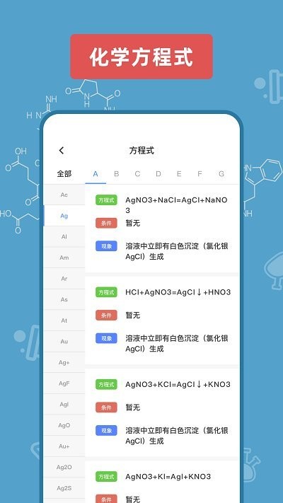 烧杯实验室提供了多种实用功能,包括物质俗称查询、物质颜色查询、金属活动表、溶解度查询、化学方程式解析、元素周期表查询以及摩尔质量计算等。这些功能全面覆盖了化学学习的各个方面,帮助用户轻松解决各类化学问题。