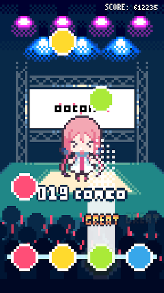 根据掉落的对应颜色的球按下对应的鼓点,让dotpict娘跳起舞来。游戏结合了音乐节奏和动作元素,玩家需要根据节奏准确点击屏幕,才能让角色跳出完美的舞蹈。丰富的音乐曲目和多样的舞蹈动作,让玩家沉浸在音乐的世界中。