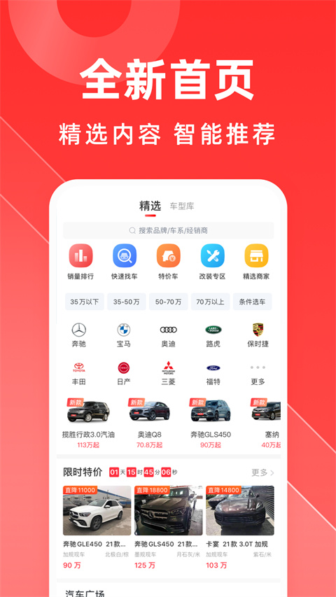 1、挑选爱车:根据品牌,车型等筛选条件,查找具体车源。用户可以通过多种筛选条件快速找到心仪的车型,节省大量时间和精力。