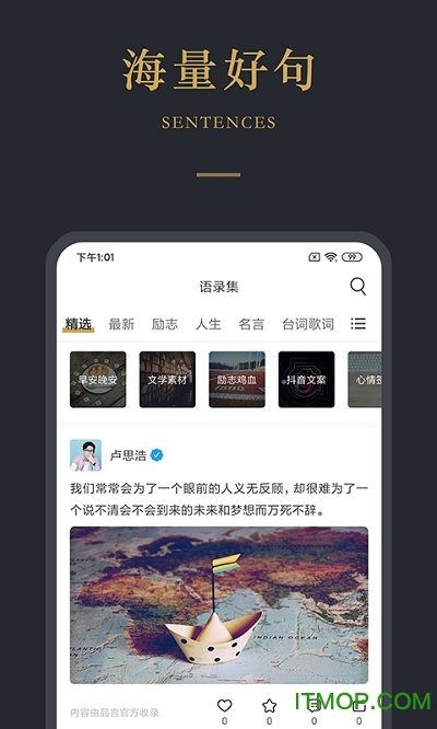 1、品言文案是一款超文艺且独具美感的阅读工具,其提供的句子资源丰富多样,且更新速度极快,满足用户对新鲜内容的需求。