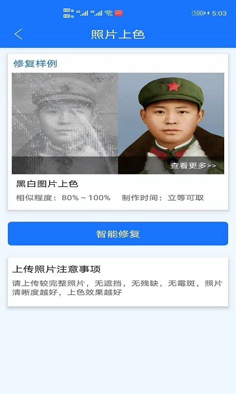 1、软件功能丰富,包括一键黑白上色、在线清晰度增强等,能够满足用户对照片修复的多种需求,操作简单且效果显著;