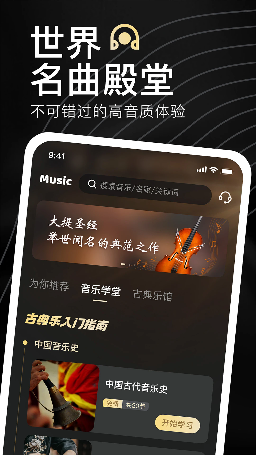4.每日精选:根据用户的听歌习惯和偏好,应用每天为用户精选一首高品质的古典音乐,帮助用户发现新的音乐风格和演奏家,拓展音乐视野。