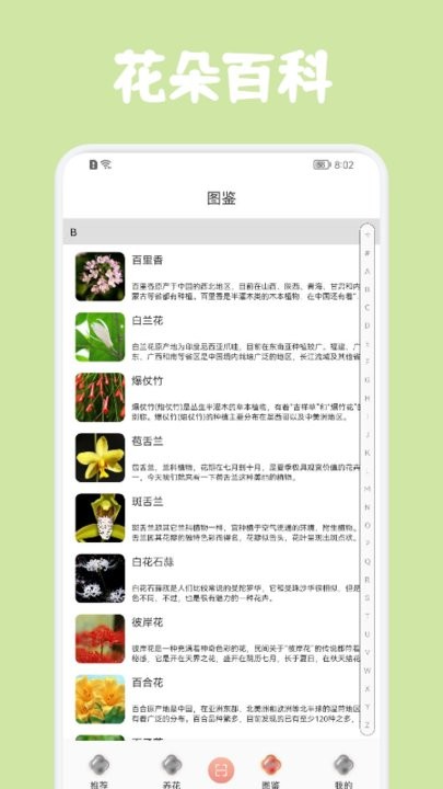 识花帮app是一款集趣味性与实用性于一体的手机植物百科知识科普软件。用户可以通过该软件轻松获取丰富的花朵知识,涵盖各类花卉的详细介绍、养护技巧以及寓意解读。软件还提供了一键拍照识别功能,只需简单拍摄或导入相册中的植物图片,即可快速识别出花朵种类,并获取专业的知识科普。无论是植物爱好者还是普通用户,都能在这里找到自己感兴趣的内容。快来下载体验,开启你的植物探索之旅吧!