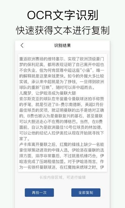 ·文字复制,一键复制识别文字内容粘贴到需要的输入框,方便用户快速编辑和使用。
