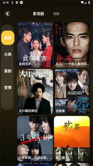 2、影视种类:对海量影视资源进行了详细分类,包括古典、喜剧、爱情、悬疑、动作等多种类型,满足不同用户的观影需求。