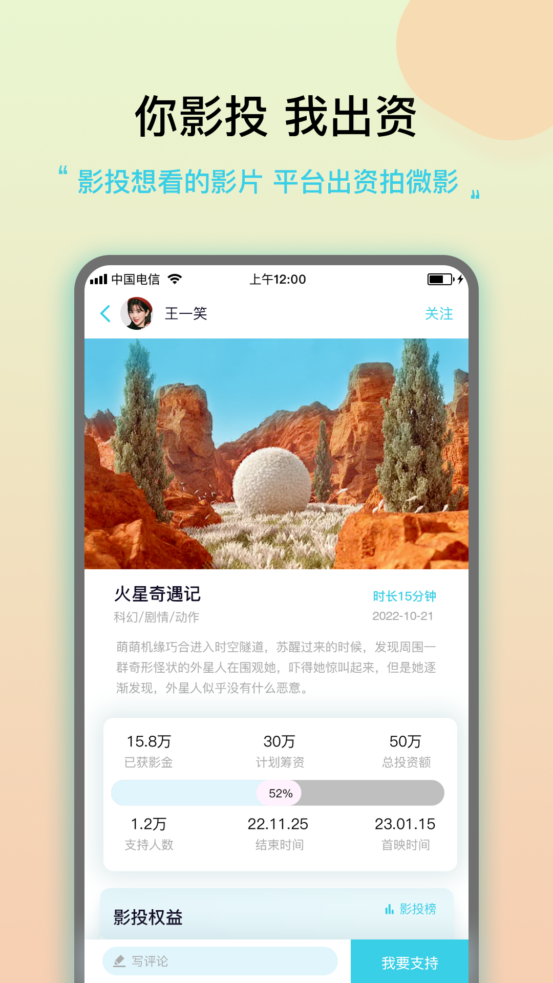用户可以通过影金支持给想看的影片投票,当影金超过影片计划筹资额时,影投即成功。平台将为制片方提供资金完成影片拍摄。微影成功上线后,平台将根据影片播放量给予影投用户奖励。这一功能让用户不仅能观看影片,还能参与到影片的制作过程中。