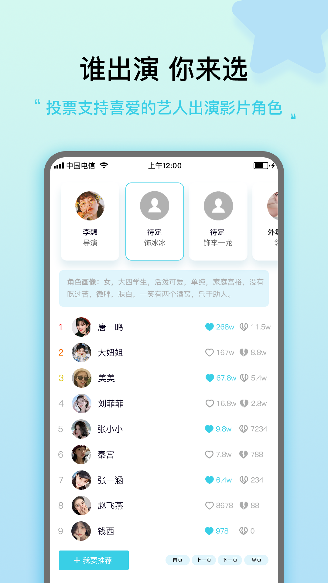 用户可以在必影app上投票支持自己喜爱的艺人出演影片。导演或制片人会根据推荐人气和技能值筛选确定角色演员。这一功能让用户能够参与到影片的选角过程中,增加了互动性和参与感。