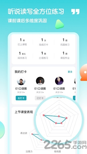 小泰熊英语最新版的外教课程设计旨在通过互动式教学提升学生的英语能力。课程中,学生通过回答教师问题和使用完整句子来展示所学知识,同时通过向教师提问和常用表达来创造有意义的对话。此外,课程还引入了synthetic phonics自然拼读法,帮助学生通过单词拼写快速解码发音,提高发音和阅读的准确性。除了1对1在线实时教学,课程还结合了每日外教口语练习、重点词汇句型巩固、单词记忆打卡、外教领读绘本、动画剧本、短文写作、口语效果秀等课外互动练习,全面系统地提升学生的英语口语应用能力,为他们的英语学习提供全方位的支持。