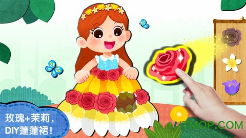 设计鲜花公主裙 — 提升创造力。为公主装饰裙子啦。挑选玫瑰、茉莉花拼在裙摆,设计鲜花裙。可以用鸡蛋花和菊花来拼贴裙子吗?宝宝发挥创意,拼拼看~