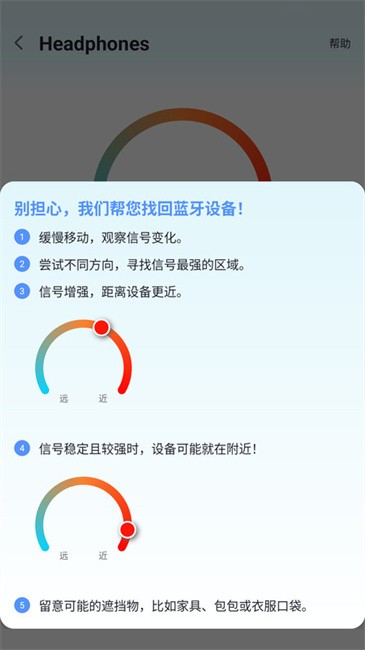 实时分析蓝牙信号强度(RSSI),显示设备与您的距离范围(远/近),助您快速缩小搜索范围。