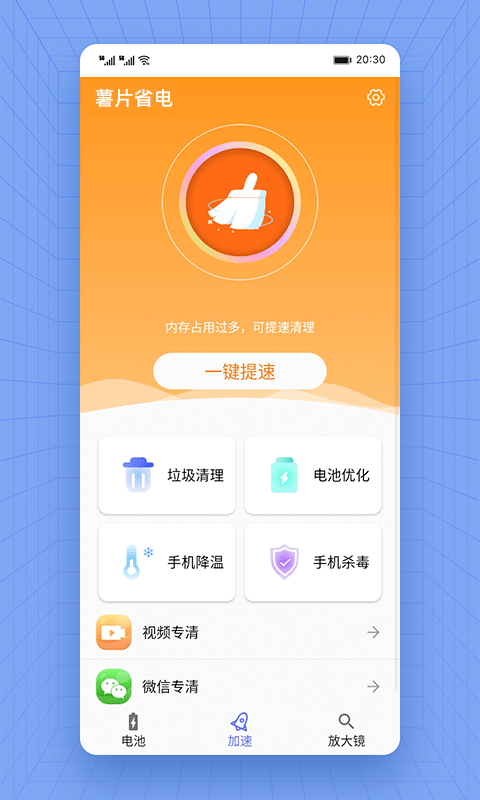 薯片省电app是一款专为提升手机续航能力而设计的实用工具,集多种功能于一体,旨在为用户提供更便捷的手机使用体验。该软件不仅支持一键省电模式,还能有效清理手机垃圾,优化系统性能,从而延长电池寿命。无论是日常使用还是特殊场景,薯片省电都能帮助用户轻松应对电量不足的困扰。其简洁的界面和强大的功能,让用户能够快速上手,享受更持久的手机续航体验。如果你正在寻找一款高效省电的软件,不妨下载薯片省电,亲自体验它的强大功能。
