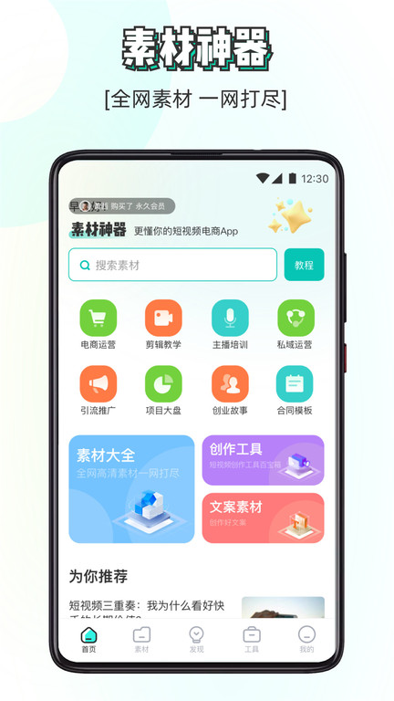 素材神器软件最新版是一款专为手机用户打造的专业素材管理平台,旨在为用户提供便捷、高效的素材管理与创作体验。无论你是视频剪辑爱好者、设计师,还是文案创作者,这款软件都能满足你的需求。软件内汇聚了海量高清视频、精美图片、创意文案等素材,覆盖多种风格与类型,用户可以根据自己的需求自由选择与下载。此外,素材神器还提供一键创作功能,即使是零基础用户也能轻松上手,快速制作出高质量的作品。每日更新的热门素材资源,让你紧跟潮流,随时获取最新灵感。如果你正在寻找一款功能强大、操作简单的素材管理工具,素材神器绝对是你的不二之选!
