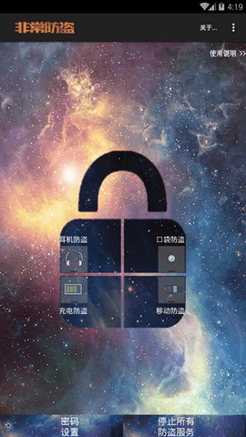 非常防盗app是一款专为手机安全设计的防盗应用,完全免费且无广告,不会收集用户的任何隐私信息,也无需root权限,是一款纯净版的手机防盗软件。该软件在手机被盗的关键时刻能够迅速触发警报,帮助用户及时找回手机。它提供了四种防盗模式:耳机防盗、口袋防盗、充电防盗和移动防盗,分别适用于不同场景下的手机保护需求。无论是公共场所使用手机,还是日常携带,这款软件都能为您的手机提供全方位的安全保障。