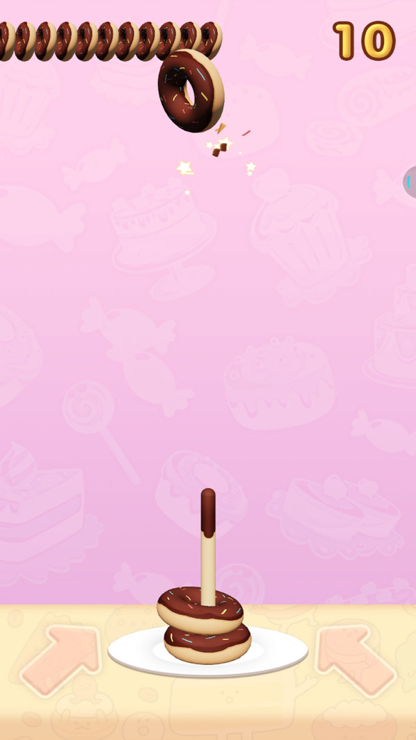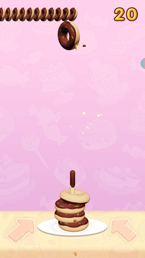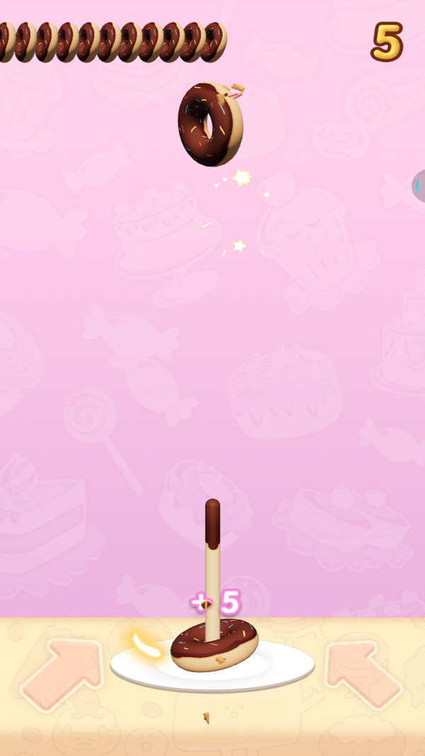 1、游戏核心玩法是套住旋转的甜甜圈,玩家需要精准把握时机,通过点击左右按钮控制套圈位置。甜甜圈的旋转轨迹会不断变化,考验玩家的反应速度和判断能力。