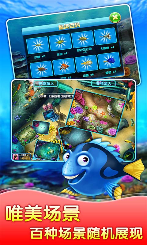 1. 游戏以海洋为背景,玩家扮演捕鱼达人,使用各种武器捕获鱼类。