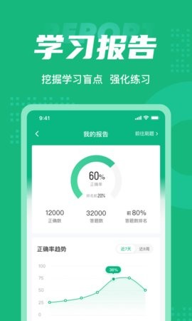 智能评估:系统会基于用户的练习记录、模拟考试成绩等数据,生成详细的能力评估报告。报告不仅显示各知识点的掌握程度,还会分析考生的薄弱环节,并智能推荐针对性练习方案。这种数据驱动的学习方式让备考更加科学高效,帮助考生在有限时间内实现最大提升。