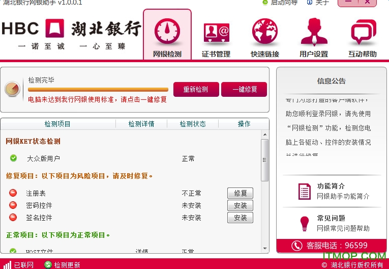 一键修复功能可以自动解决检测中发现的大部分问题,包括自动下载安装缺失的控件、修复错误的系统配置、更新过期的安全证书等。修复过程全程可视化,用户可以实时查看修复进度。对于需要用户配合的操作,如插入USBKEY等,系统会给出明确提示。修复完成后会自动进行验证测试,确保问题得到彻底解决。该功能大大降低了用户自行配置网银环境的难度,让网银使用更加便捷安全。
