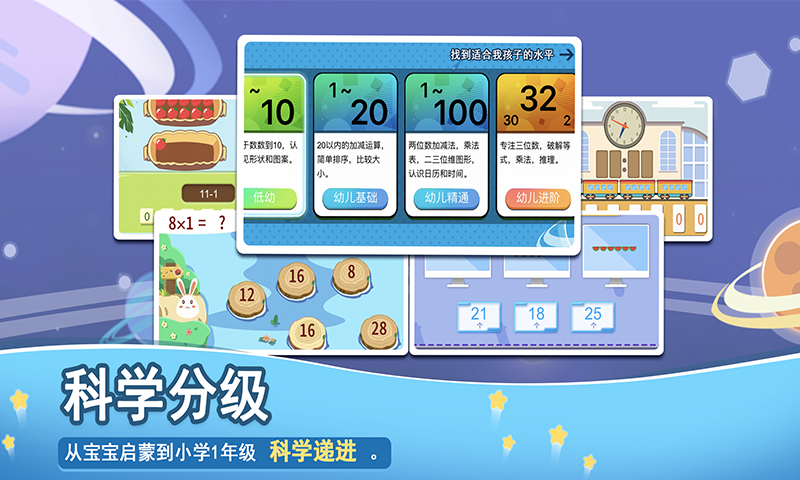 采用国际通用的数学能力发展标准,将学习内容划分为4个递进阶段。低幼阶段通过卡通动物数数、形状配对等游戏培养数感;幼儿基础阶段引入数字比较和简单运算;精通阶段拓展到两位数计算和立体图形认知;进阶阶段则侧重逻辑推理和复杂运算。每个阶段都配备能力测评系统,智能推荐适合的学习内容。