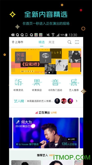 听果音乐以音乐为核心,创新性地将现场演出、艺人互动和活动体验完美融合。平台汇聚了全国一线城市最具特色的音乐酒吧和LiveHouse资源,邀请众多知名实力唱将和Live艺人入驻。无论是激情四射的摇滚现场,还是优雅动人的爵士之夜,各类精彩表演应有尽有。在这里,你可以发现最新潮的音乐活动,结识志同道合的音乐伙伴,更能与喜爱的艺人零距离互动。听果音乐致力于为每一位音乐爱好者打造专属的音乐世界,满足你对音乐的所有期待和想象。