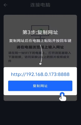 4、将生成的网址复制到电脑浏览器地址栏,按回车键即可建立连接,开始高速文件传输