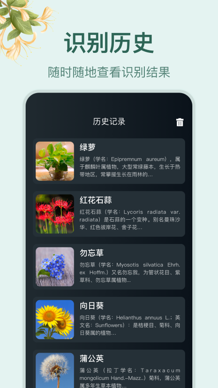 随时随地查看识别结果。识别记录会自动保存在个人中心,方便用户随时查阅历史识别记录,跟踪植物生长变化。
