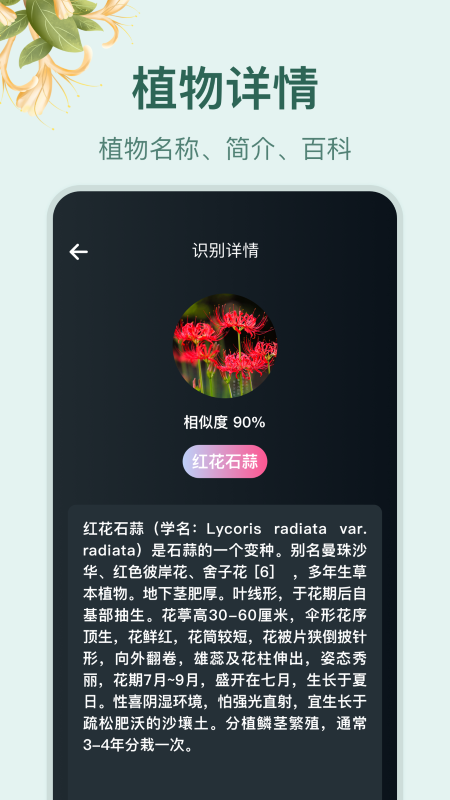 1秒就知道植物名字和故事。采用最新的图像识别技术,识别准确率高达95%以上,即使是相似品种也能准确区分。