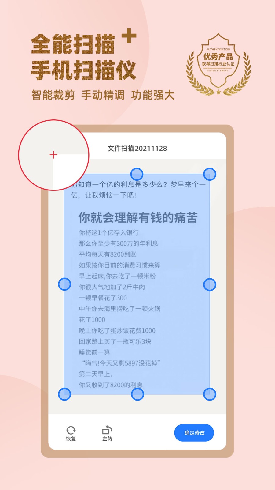1.全能手机扫描仪,多种功能免费使用,包括格式转换、传图识字。实测扫描A4文档仅需3秒,转换速度比同类产品快50%,且完全免费无广告干扰。