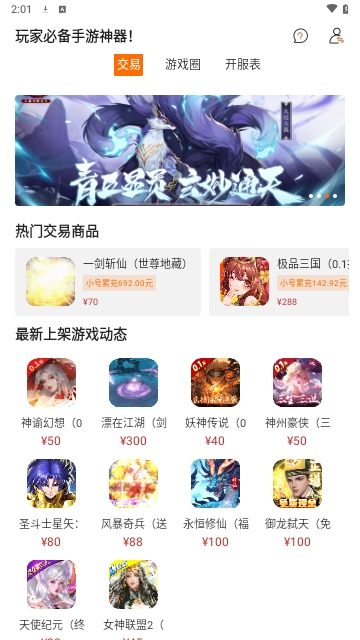 2、进入【交易】页面后,用户可以浏览到丰富的游戏商品动态信息。这里不仅提供游戏账号交易,还包括装备、道具等多种游戏物品的交易服务,满足玩家的各种需求。