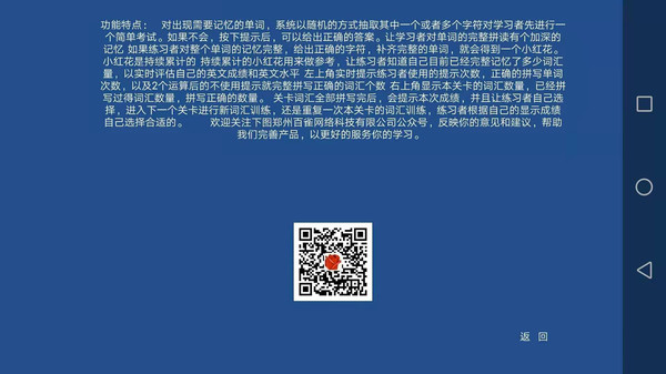英语词汇速记是郑州百雀网络科技有限公司精心打造的一款高效单词记忆软件。该软件采用创新的字母填空模式,通过趣味互动帮助用户牢固掌握单词拼写与含义。系统化的学习方案结合科学的记忆曲线,让每个单词都能深深印刻在脑海中。无论是备考四六级、考研英语,还是日常提升词汇量,这款软件都能提供专业支持。其简洁直观的界面设计,配合智能化的学习进度管理,让背单词变得轻松高效。现在下载即可开启科学记忆之旅,快速扩充您的英语词汇库。