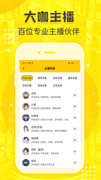 3、拥有超过600位专业级智能主播,涵盖各种年龄、性别、语言和风格,满足多样化配音需求。