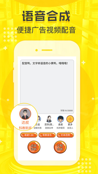 配音鸭是一款专业且有趣的文字转语音软件,以可爱的小黄鸭形象为用户带来轻松愉快的使用体验。最新版本优化了语音合成引擎,使转换效果更加自然流畅。软件操作简单直观,只需输入文本内容,就能快速生成专业级音频文件,并支持一键导出到手机或U盘。