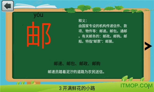 2、软件内置智能语音评测功能,可以实时纠正孩子的发音问题。每个生字都配有标准朗读、常用组词、典型例句和趣味小故事,通过多维度训练提升孩子的语言应用能力。