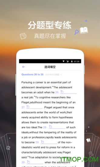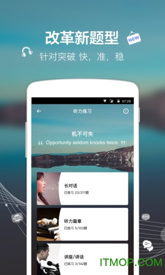 担心改革后新题型难住你?Easy姐帮你!覆盖听力、阅读的六大题型,专项练习,针对突破!六级讲座讲话提前练,考试轻松过!针对最新考试大纲,app特别强化了听力讲座、长篇阅读等新题型训练。通过模拟真实考试场景,让用户提前适应新题型,考试时更加从容自信。