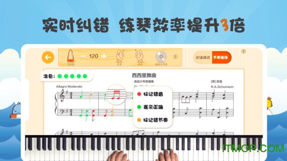 精准识别错音,弹错停止,消灭错音,高效练琴。采用专利音频识别技术,能准确判断音高、时值错误。错误提示方式多样,包括视觉高亮、震动反馈等。支持错误片段循环练习,直到完全掌握为止。