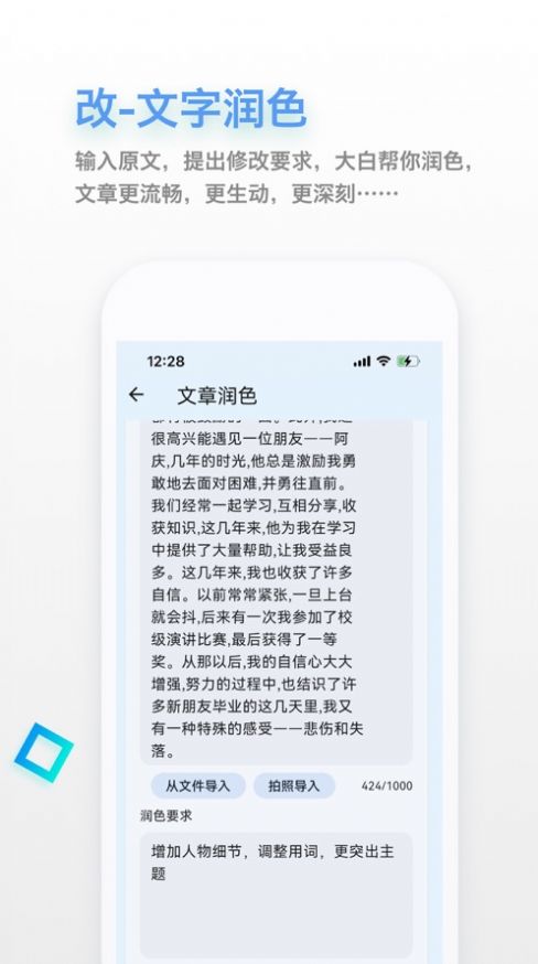 2、大白使用最新的AI技术,助你完成更好的作品,基于GPT-4架构的算法模型,能够理解复杂写作需求,生成富有创意的内容。