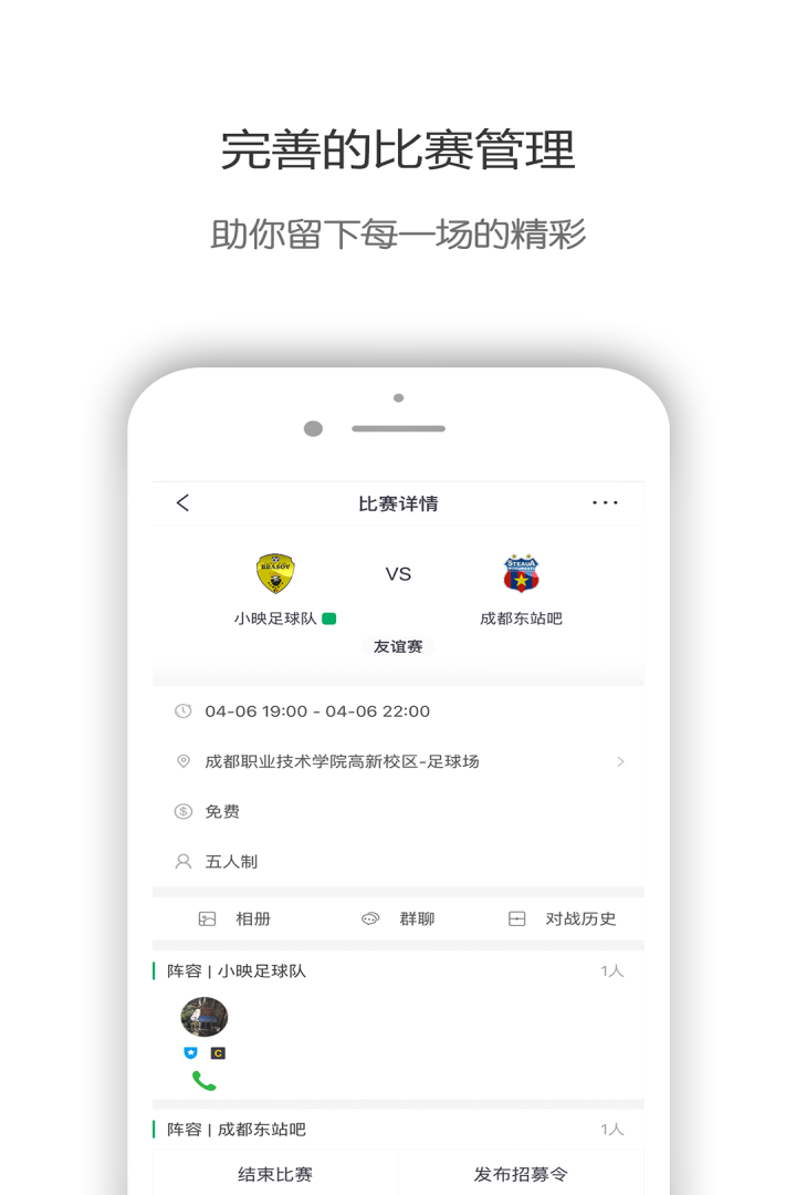 比赛模块提供从组织到记录的全流程服务。您可以轻松创建比赛,智能推荐场地,实时记录阵容和比分。赛后自动生成精彩集锦,永久保存珍贵回忆。球队管理功能支持创建专属球队空间,包含成员管理、群聊互动、财务透明化等功能。独特的相册功能让您随时回顾球队成长历程,记录每个精彩瞬间。更有专业的战术板工具,助您在赛前制定完美策略。