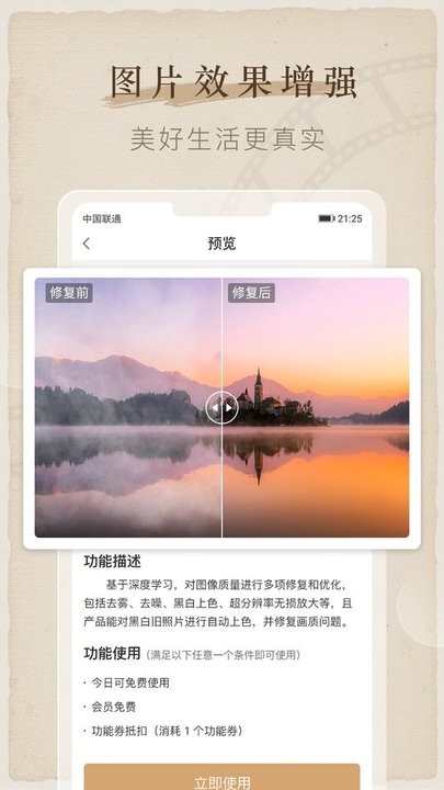 1、搭载先进的AI修复技术,能够智能识别并修复各种老旧照片的划痕、褪色等问题,特效库包含数十种专业修复方案,用户可以根据照片状况自由选择最适合的修复模式。