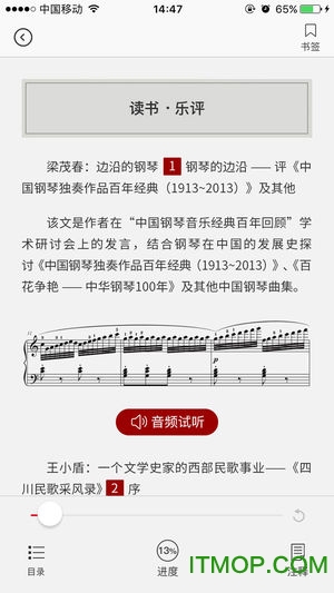 音乐艺术声像版手机APP完美实现了"读谱听音"这一核心功能,彻底改变了传统音乐期刊的阅读方式。在浏览学术论文时,用户只需轻触谱例下方的播放按钮,就能即时欣赏到专业演奏家演绎的对应段落。随着技术的不断升级,未来版本还将逐步增加视频嵌入功能,让音乐学习更加立体全面。这款APP针对iOS和Android两大移动平台进行了深度优化,从界面设计到交互逻辑都充分考虑了手机用户的阅读习惯。无论是字体大小、页面布局还是功能设置,都经过精心调试,力求为音乐学者和爱好者提供最舒适便捷的数字阅读体验。
