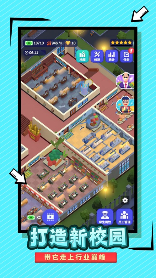 这是一款充满欢乐与挑战的校园模拟经营游戏,玩家将化身为一名精明能干的校长,全面掌管一所私立学校的运营与发展。游戏采用清新可爱的卡通画风,生动还原了校园生活的点点滴滴。从教室到操场,从食堂到宿舍,每个场景都经过精心设计,让玩家仿佛置身于真实的校园环境之中。你需要通过合理分配资源、优化课程设置、招募优秀教师等方式,不断提升学校的教学质量和声誉,吸引更多优秀学子前来就读。游戏不仅考验玩家的管理智慧,更能让你重温校园时光,实现儿时当校长的梦想。