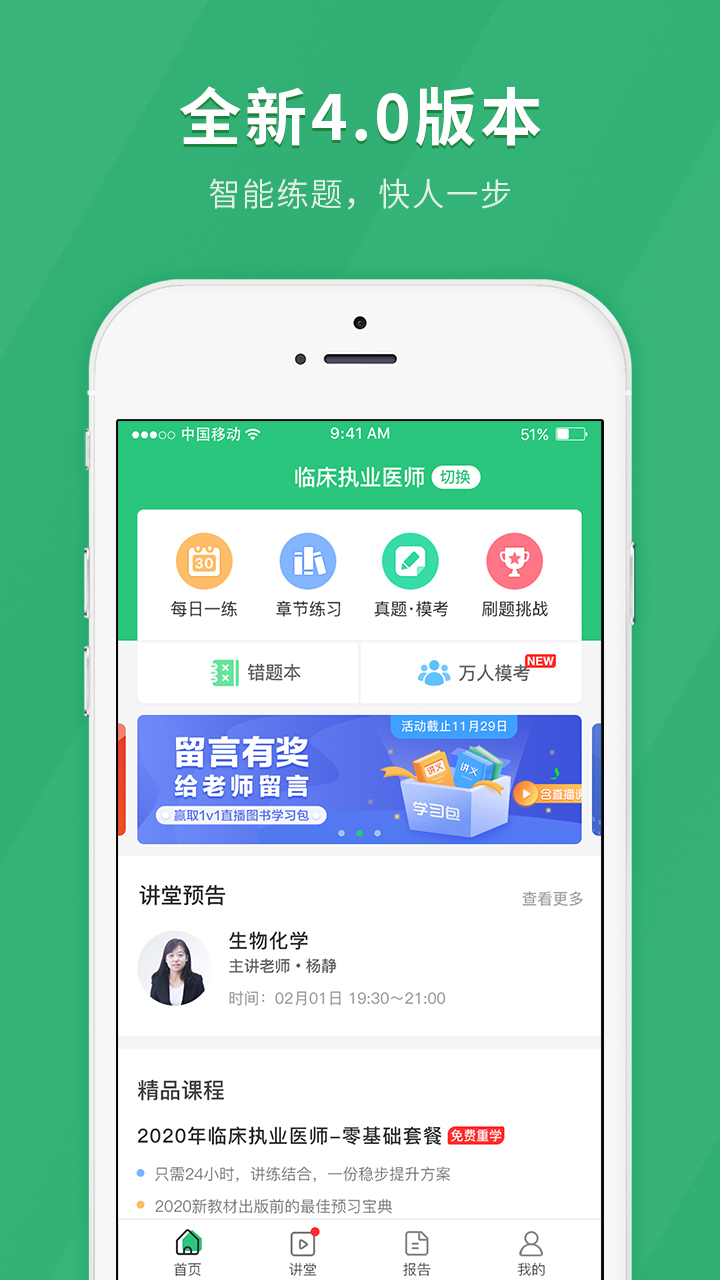 临床医师快题库在线课程,在线直播+录播,全程名师授课,工商管理、人力资源管理、会计、法学、金融、软件工程、护理学等多个本科专业课程。在线题库,助手。平台特别增设"临床病例库"模块,收录3000+真实病例分析,每个病例均包含病史采集、体格检查、辅助检查、诊断治疗全流程解析。针对执业医师考试需求,独家推出"考点图谱"功能,通过大数据分析将高频考点可视化呈现,帮助学员快速建立知识框架。学习助手24小时在线答疑,支持语音、图文多种咨询方式。